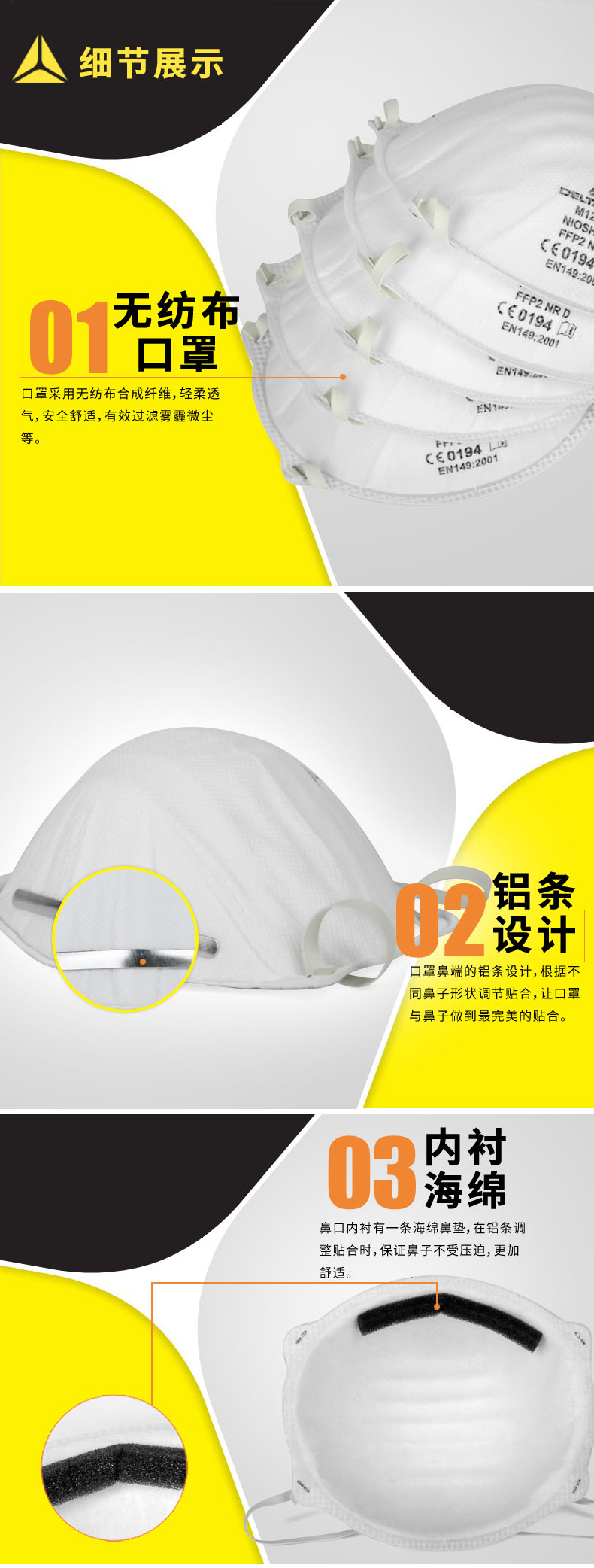 1、轻薄透气无纺布面料,呼吸阻力低,有效过滤粉尘雾霾等