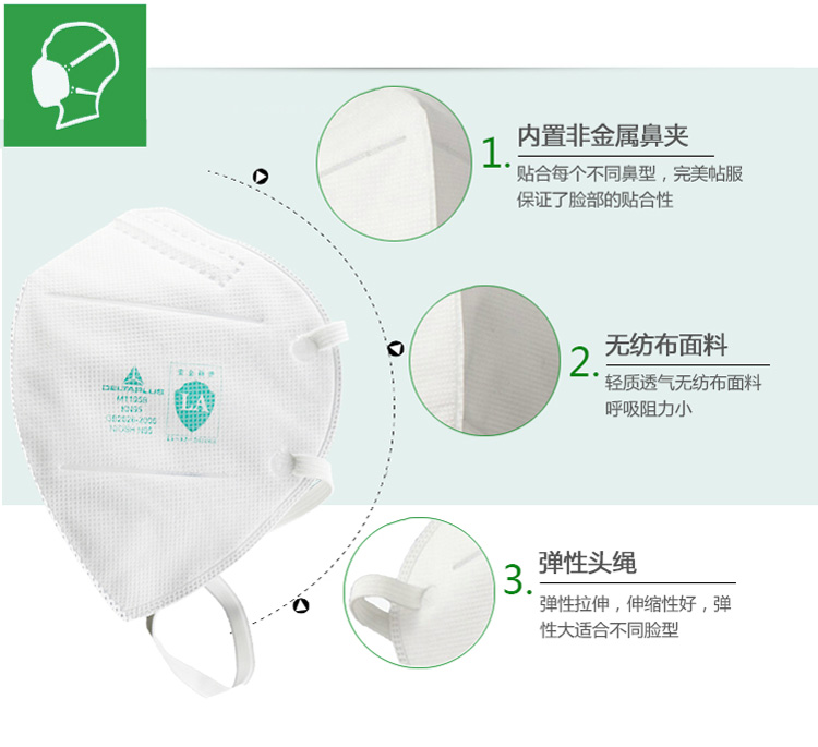 1、轻薄透气无纺布面料,呼吸阻力低,有效过滤粉尘雾霾等
