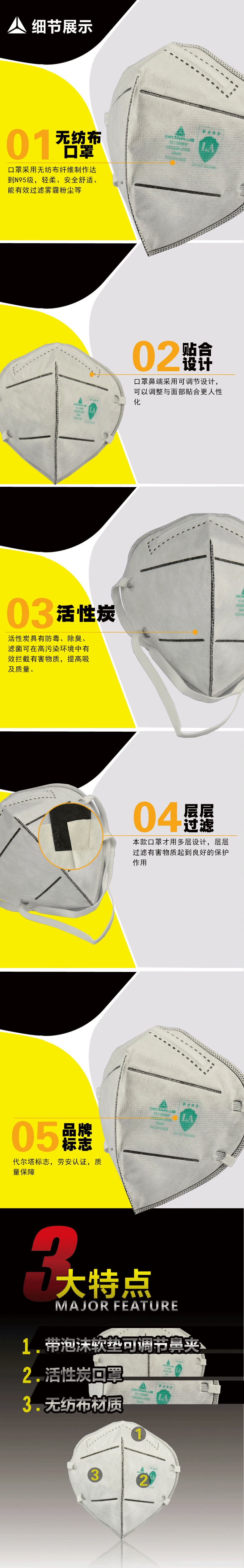 1、轻薄透气无纺布面料,呼吸阻力低,有效过滤粉尘雾霾等