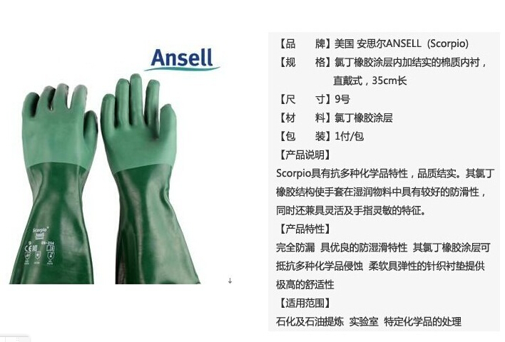 安思尔ansell8-354,Scorpio具有抗多种化学品特性,品质结实。其氯丁橡胶结构使手套在湿润物料中具有较好的防滑性,同时还兼具灵活及手指灵敏的特征。 |