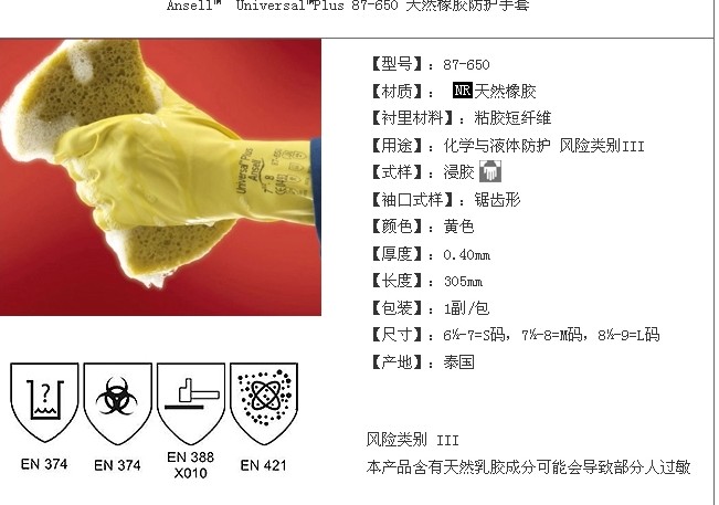 安思尔ansell87-650:100%天然橡胶提供具有较高张力的灵敏性; 纯棉织物非常柔软,无刺激,非常舒适; 尤其能降低过敏反应的风险。 |