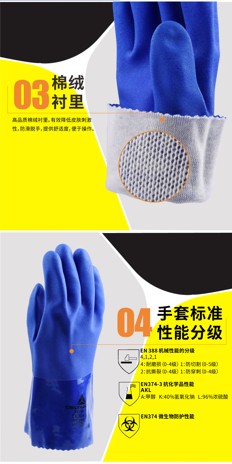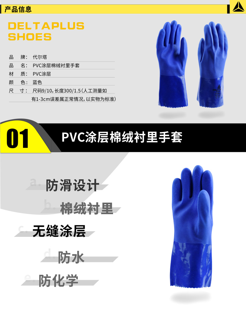 | 代尔塔201780手套工作劳保工业防滑PVC涂层防化 耐磨棉绒衬里防水 |