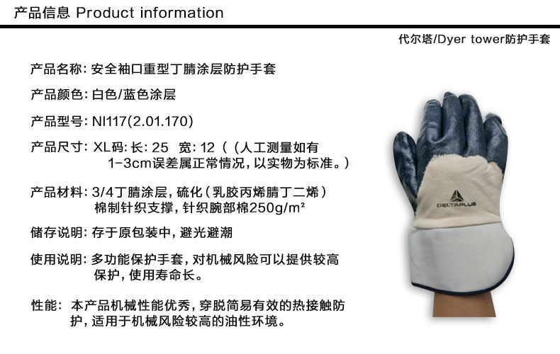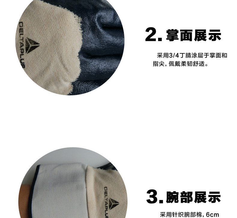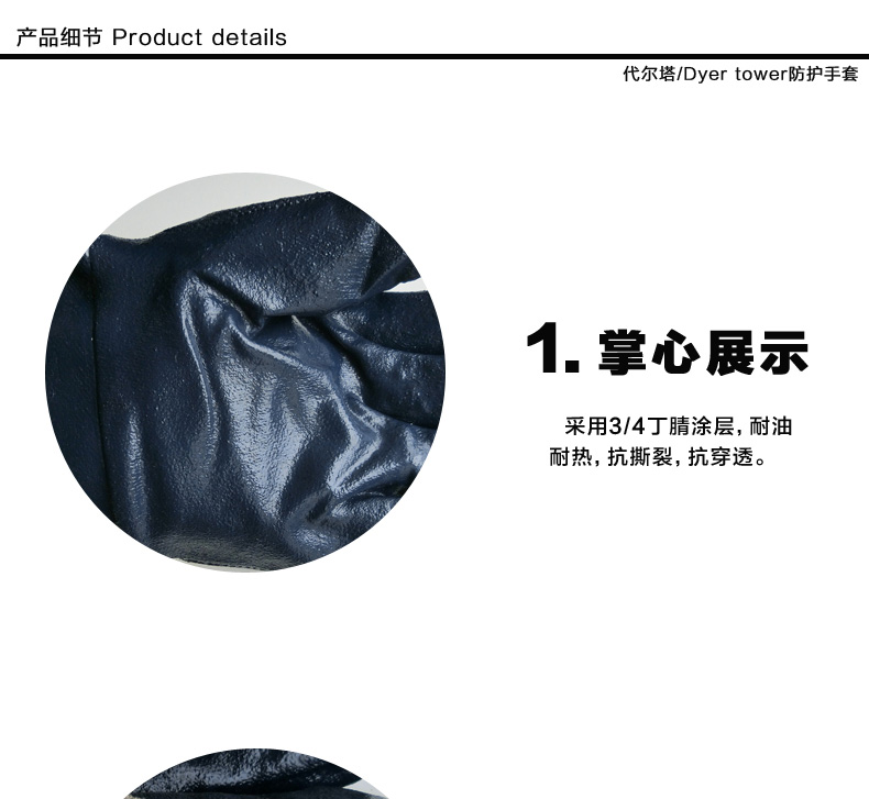 1、掌面和手指丁腈涂层,耐磨性能好,佩戴舒适