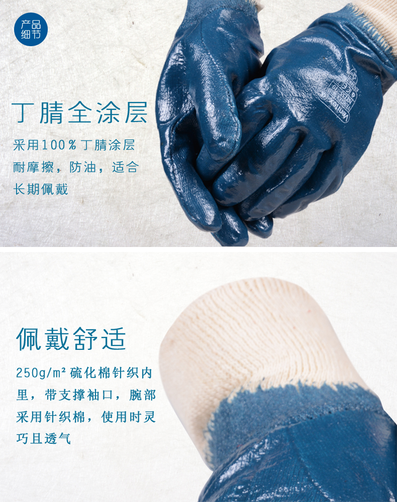 1、丁腈全涂层,耐摩擦,适合长期佩戴