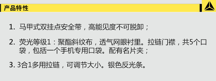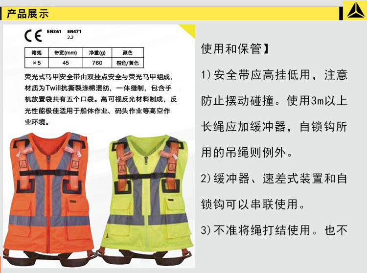 1、马甲式双挂点安全带,高能见度,不可脱卸