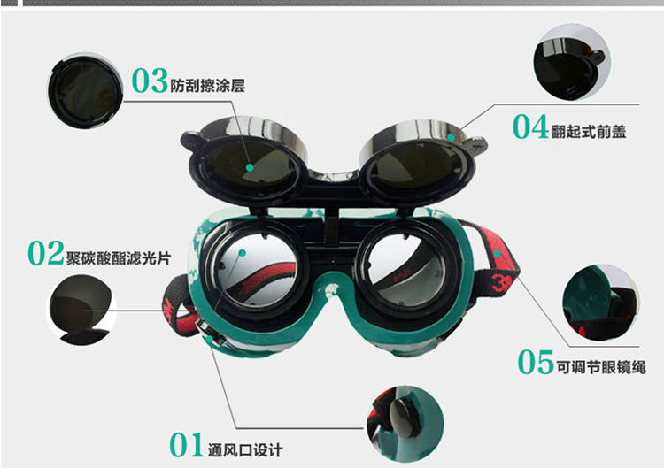 可翻起式前盖设计,镜片易于更换;采用IR5.0聚碳酸酯镜片的焊接防护眼镜,有效阻隔99%紫外线及98%红外线。 |