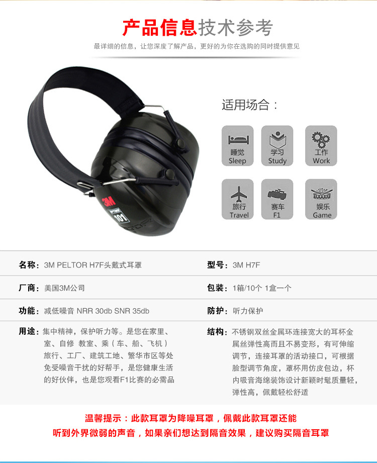 噪音降低率NRR: 24dB SNR: 31dB,有两点不锈钢支撑宽而厚的耳杯,不易变形,