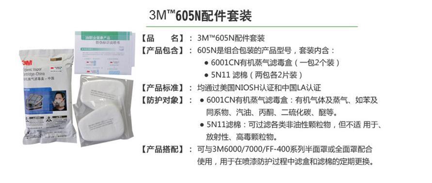 套装包含:6001CN有机蒸汽滤毒盒(一包2个装), 5N11滤棉(两包各2片装) |