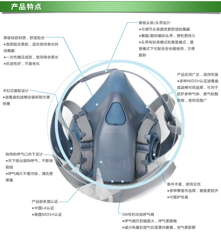 质轻硅质面具,与脸部双层密合,6点位头带调节,提供更好密合性与舒适性; 大直径吸气阀及呼气阀片,使呼吸更轻松