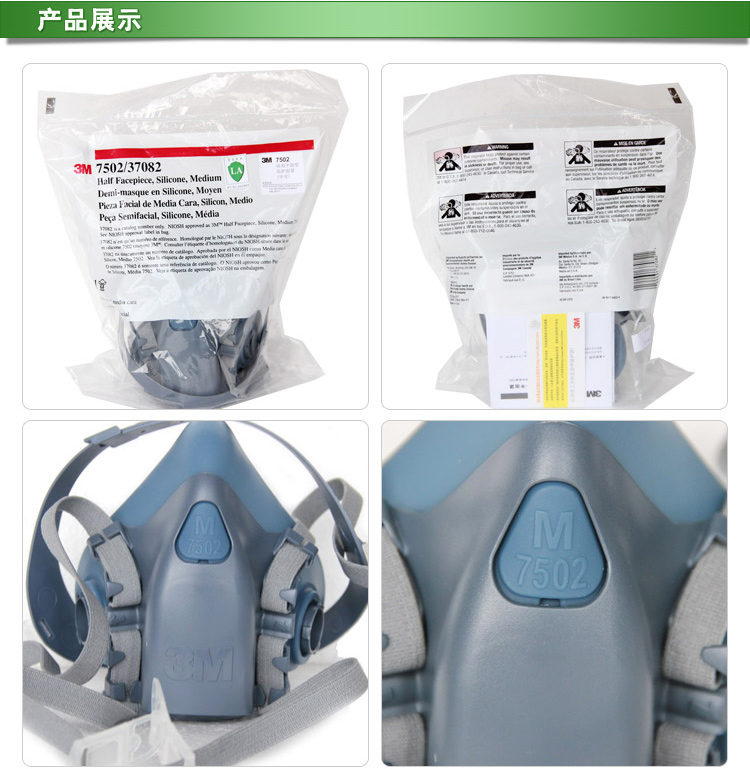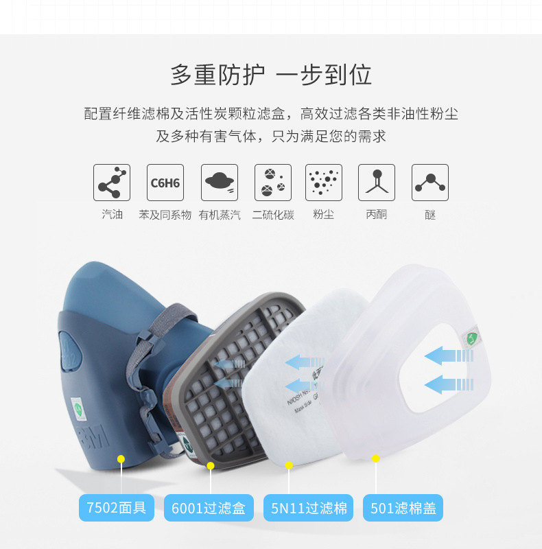 3M 7502/7501面具 1个, 3M 6001滤盒 2个, 3M 5N11滤棉 4片, 3M 501滤棉盖 2个, |