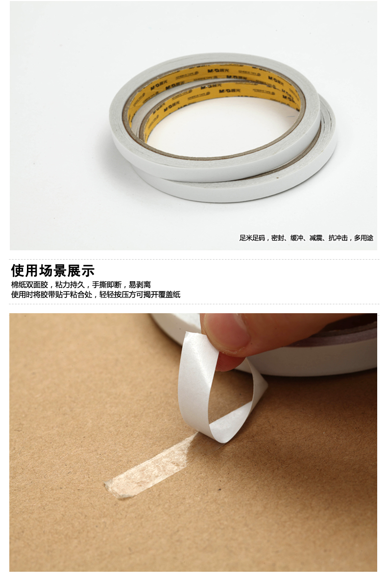 棉纸双面胶,粘力持久,手撕即断,耐高温,不溢胶 |