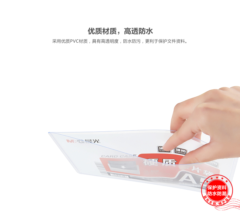 优质PVC材质,高透防水,内袋防静电设计,容易开合,加强边设计,有效保护资料