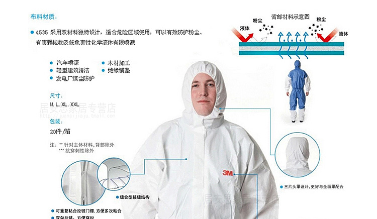 4535采用PE复合材料和透气型SMS后背,这两种材料的结合在很大限度提供防护性的同时,又不失透气性和舒适性,有效防护粉尘、有害颗粒物和液体有限喷溅。