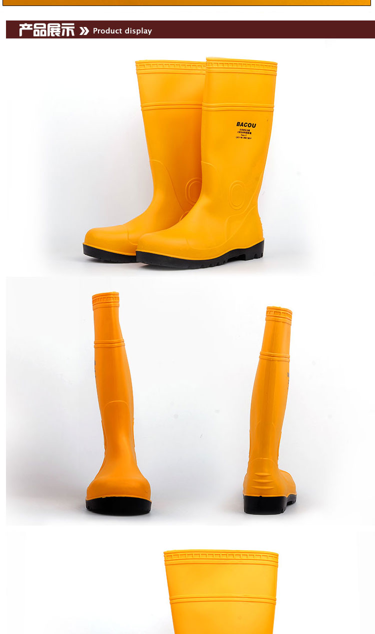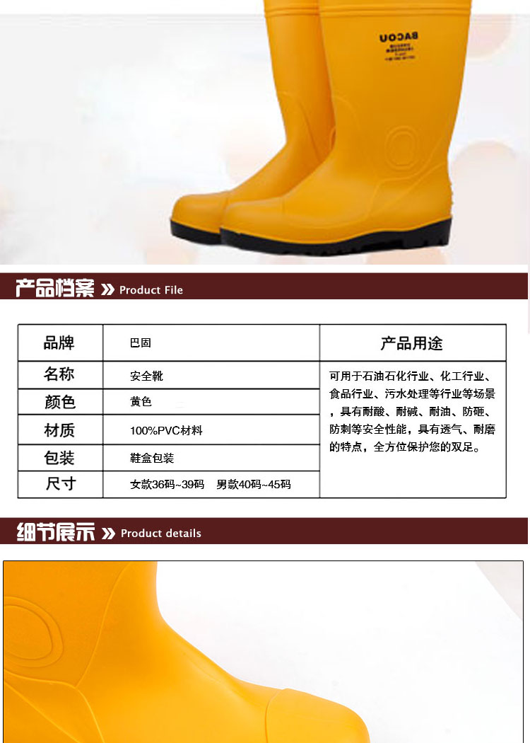 6、具备保护足趾、靴底防刺穿(可选)、耐酸碱、耐油、防滑、耐磨损等功能。