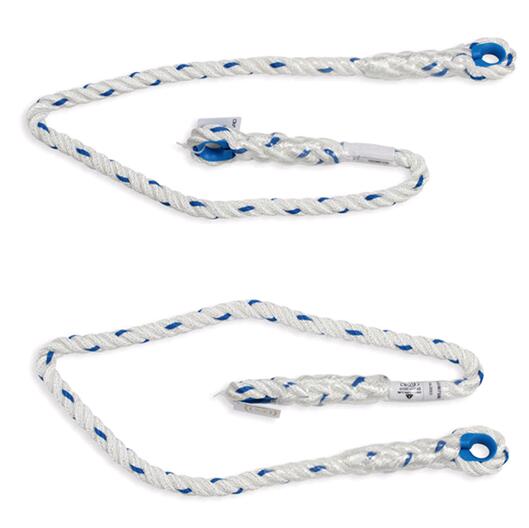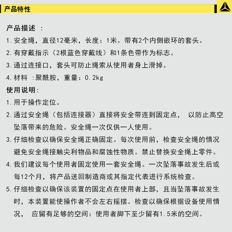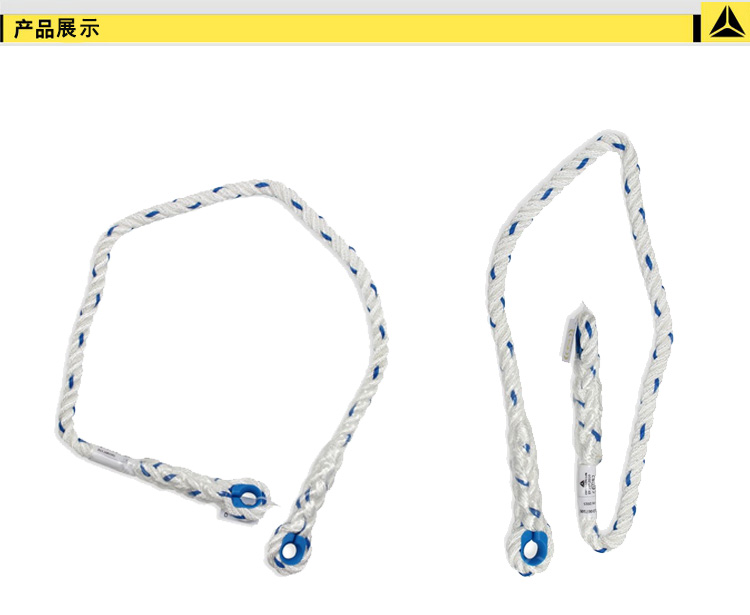 1、安全绳,带有2个内侧嵌环的套头,通过连接口,可防止绳索从使用者身上滑掉