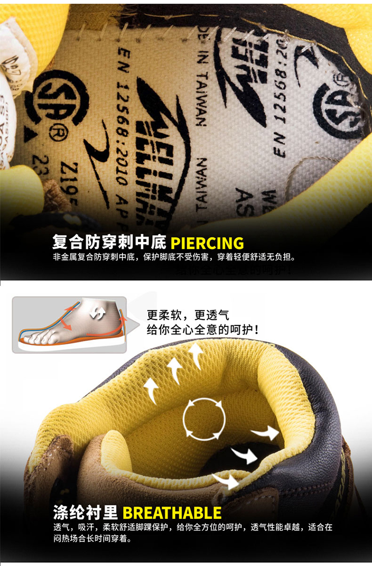 传奇系列COMPOSITE高科技符合技术安全鞋; 磨砂皮面,聚氨酯橡胶复合鞋底,可脱卸聚酯纤维;EVA鞋垫; SRC级防滑,HRO级耐热接触,耐油性能卓越,能适应多种不同环境作业。 |