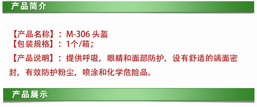 提供呼吸,眼睛和面部防护,设有舒适的端面密封,有效防护粉尘,喷涂和化学危险品。