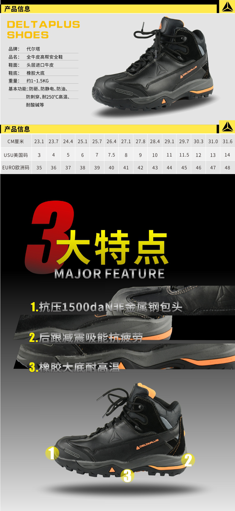 防砸、防穿刺、防静电、后跟减震、耐磨、耐油、耐酸碱、SRC级防滑、耐高温250℃、耐寒。 |