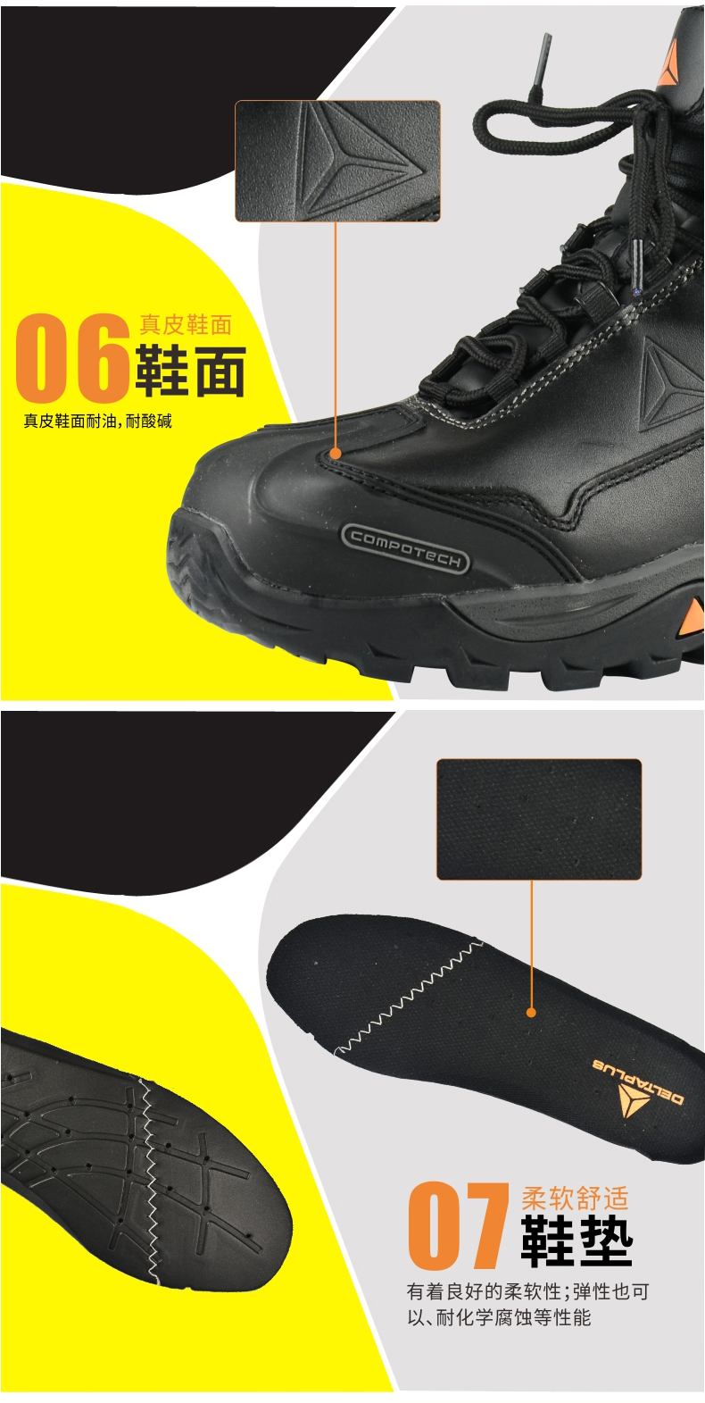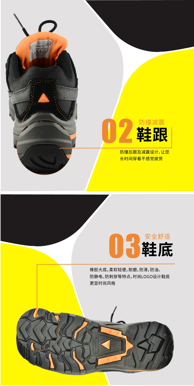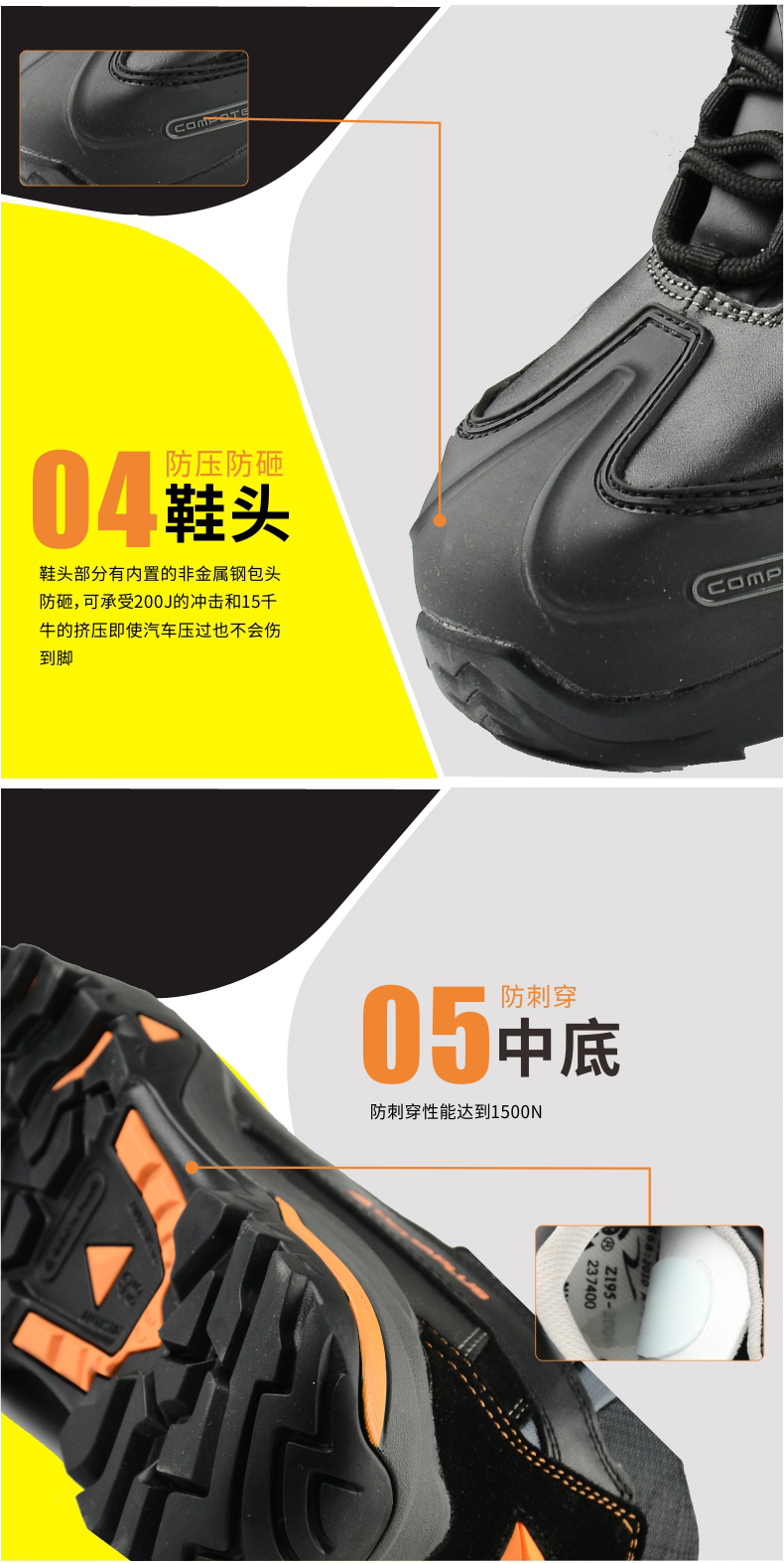 3、橡胶大底,非金属合成材料保护包头和防穿刺中底。