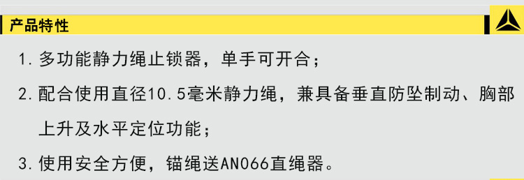 2、配合使用直径10.5毫米静力绳,兼具备垂直防坠制动。胸部上升及水平定位功能