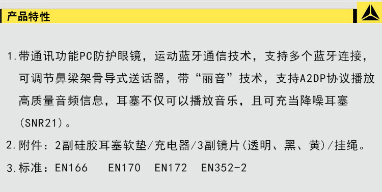 1、带通讯功能PC防护眼镜,运动蓝牙通讯技术,可调节鼻梁架骨导式送话器