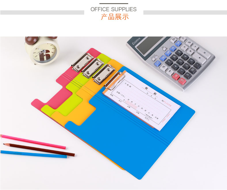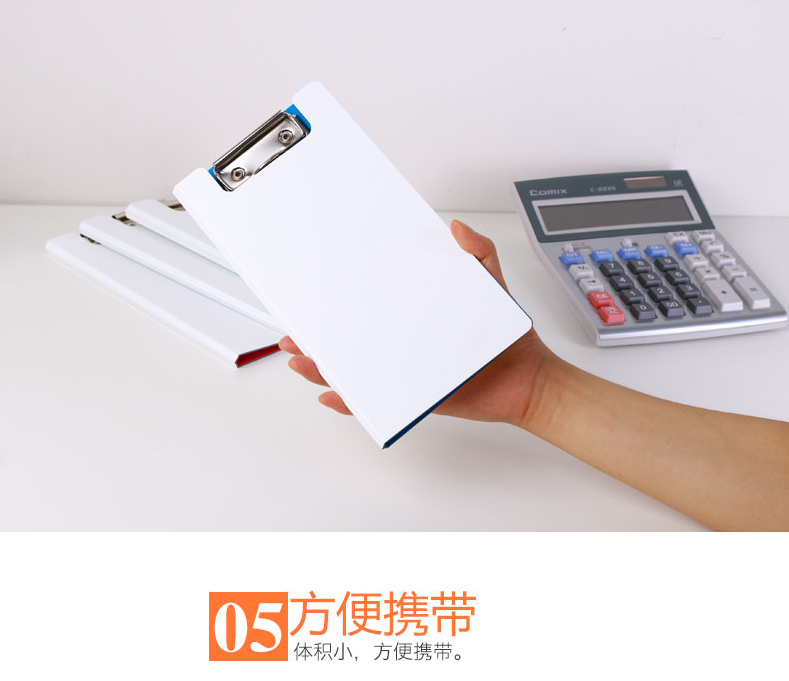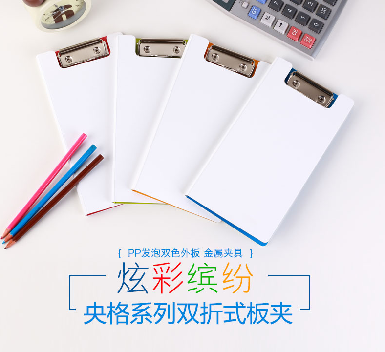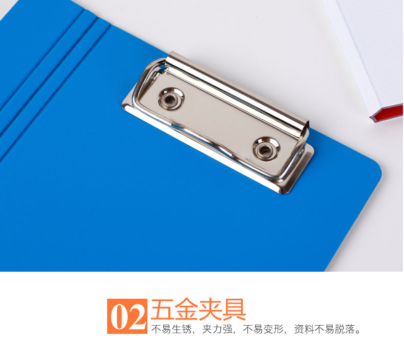 不锈金属铆钉装双折式板夹,牢固耐用。