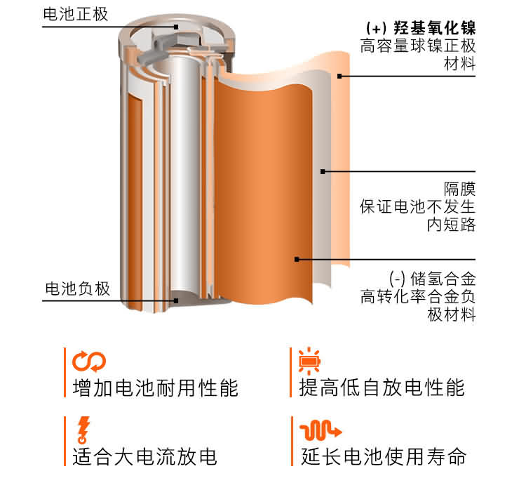 1、高容量球镍正极材料,高转化率合金负极材料,增加电池耐用性能