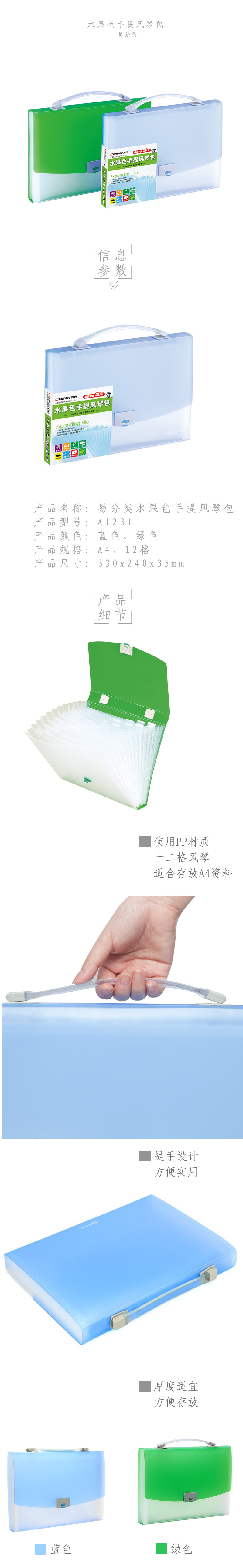 | 齐心A1231 易分类 水果色风琴包 A4 12格 手提式 |