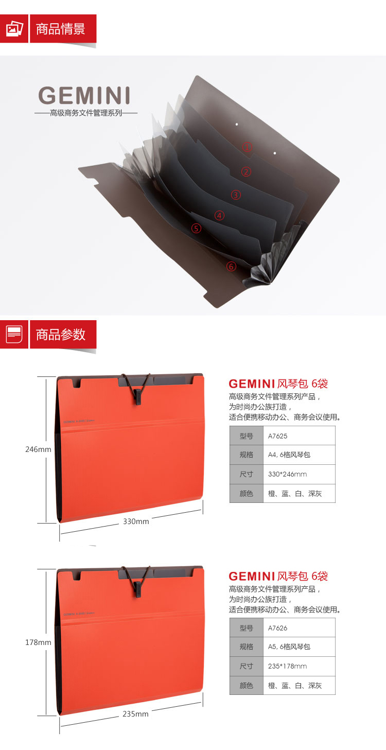 | 齐心A7625/A7626 Gemini 6袋风琴包 A4 |