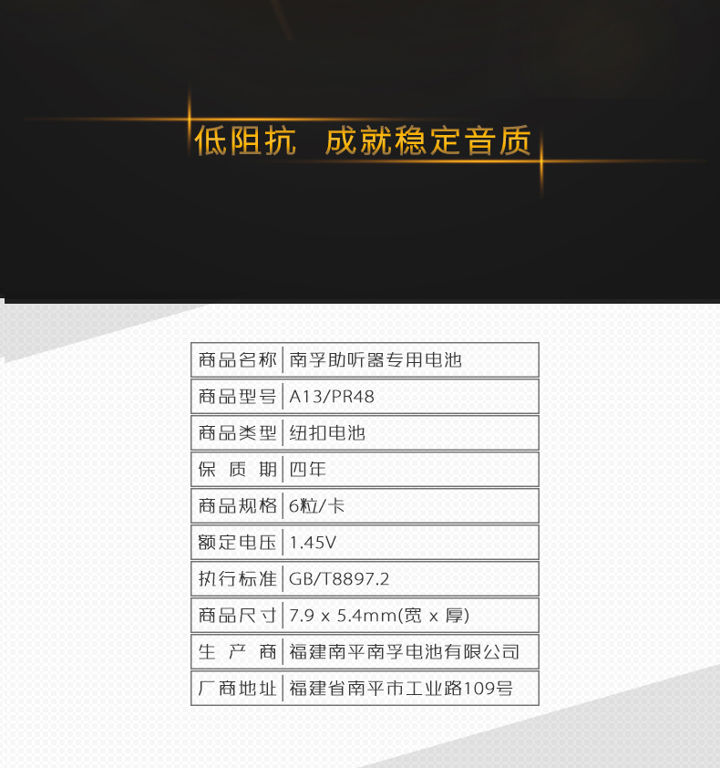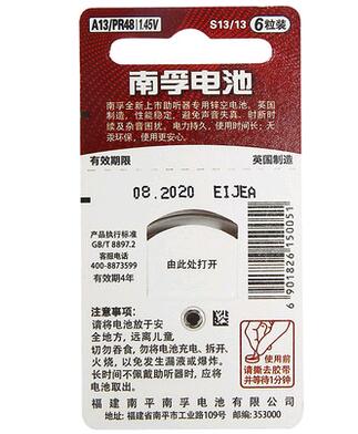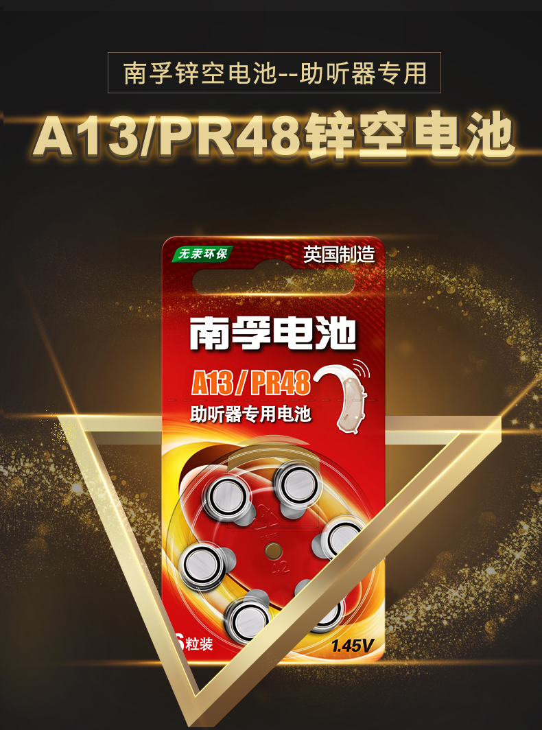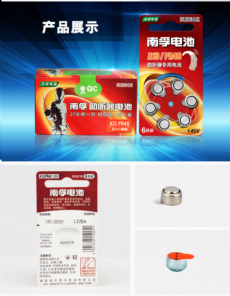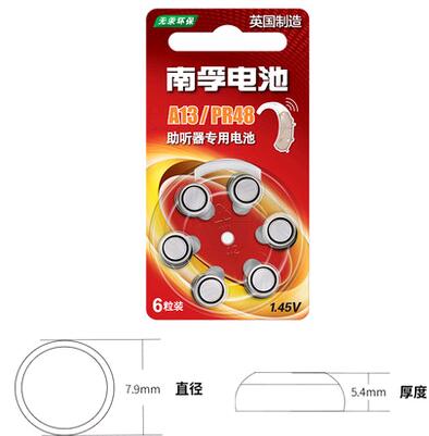 | 南孚助听器锌空电池A13 PR48 S13 P13耳蜗/内耳背式纽扣小电子6粒 |