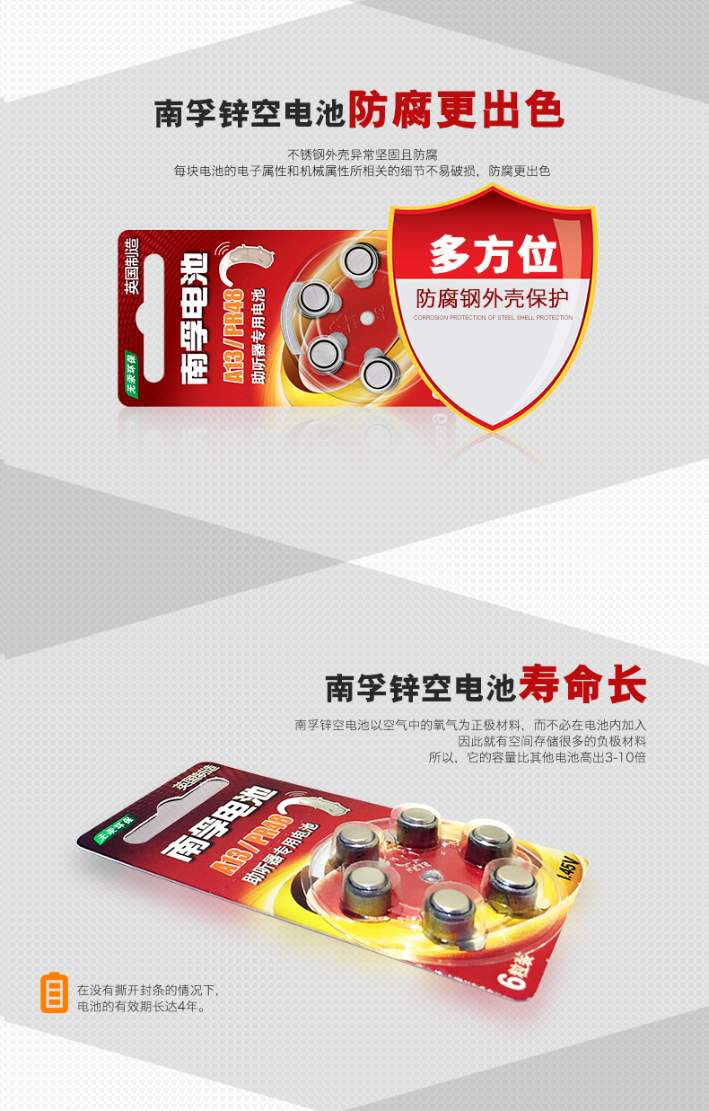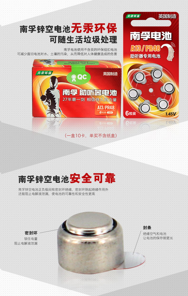 1、南孚锌空电池无汞环保,减少污染,降低伤害