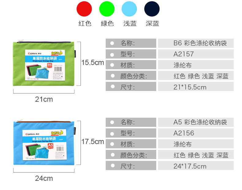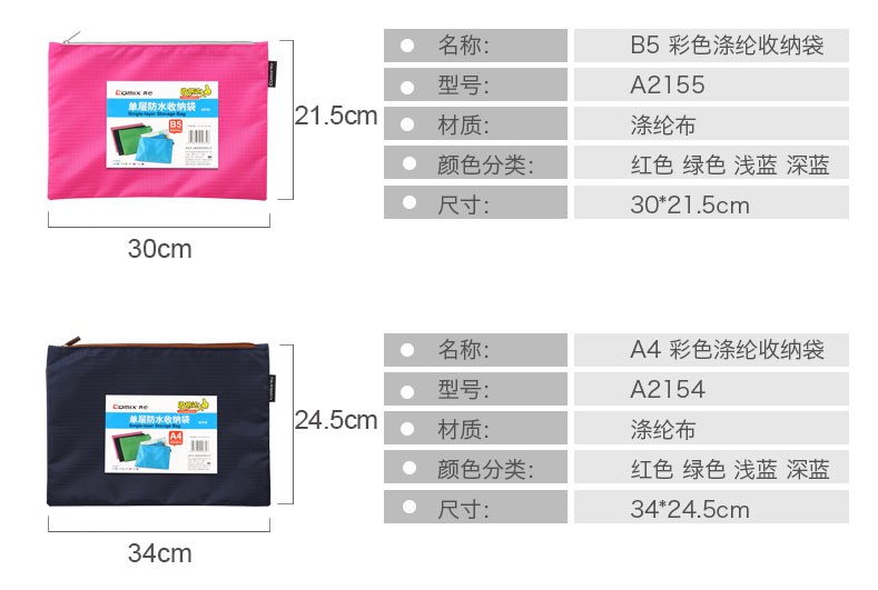 | 齐心A2154,A2155,A2156,A2157 单层彩色防水收纳袋 |
