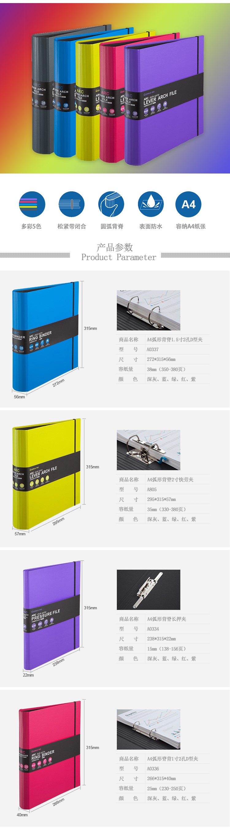 | 齐心A0334,A0336,A0337,A805 弧形脊背长押夹/2孔D型夹/快劳夹 | |||