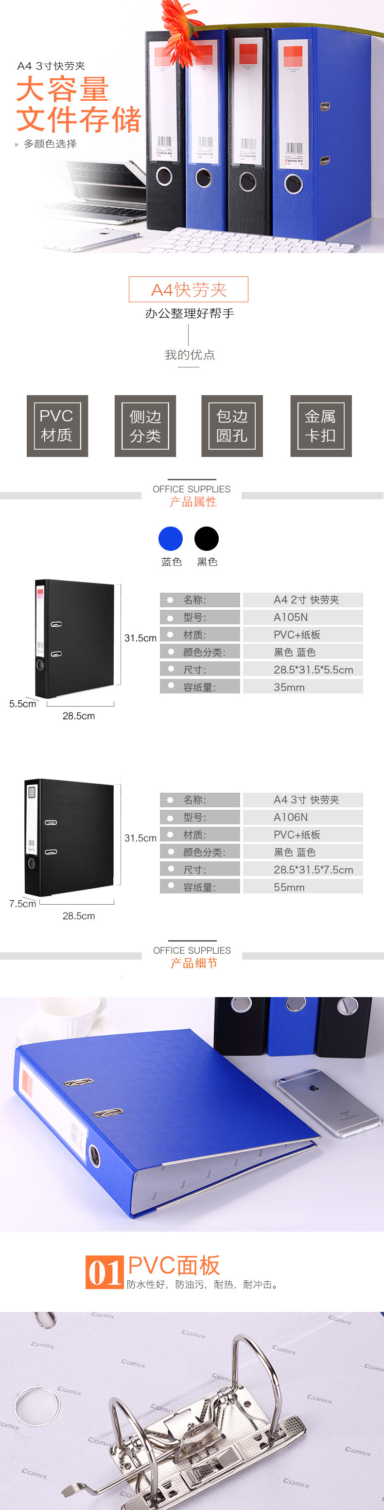 PVC面板,防水性好,防油污、耐热、耐冲击, 大容量金属夹具,文件不掉落,替换资料更省力 |