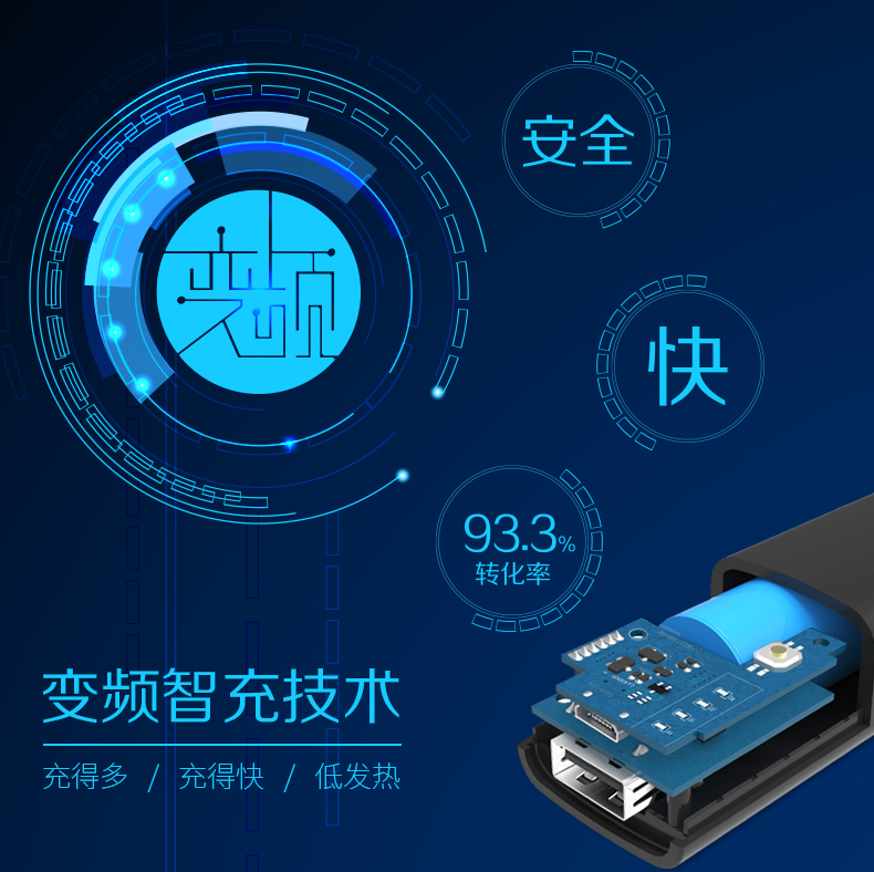 2、变频智充技术,充的多、充的快、低发热