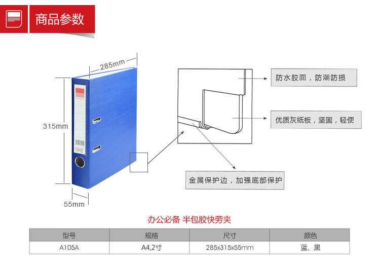 >> 齐心A105A,A106A, A107A, A108A 半包胶快劳夹2孔文件夹