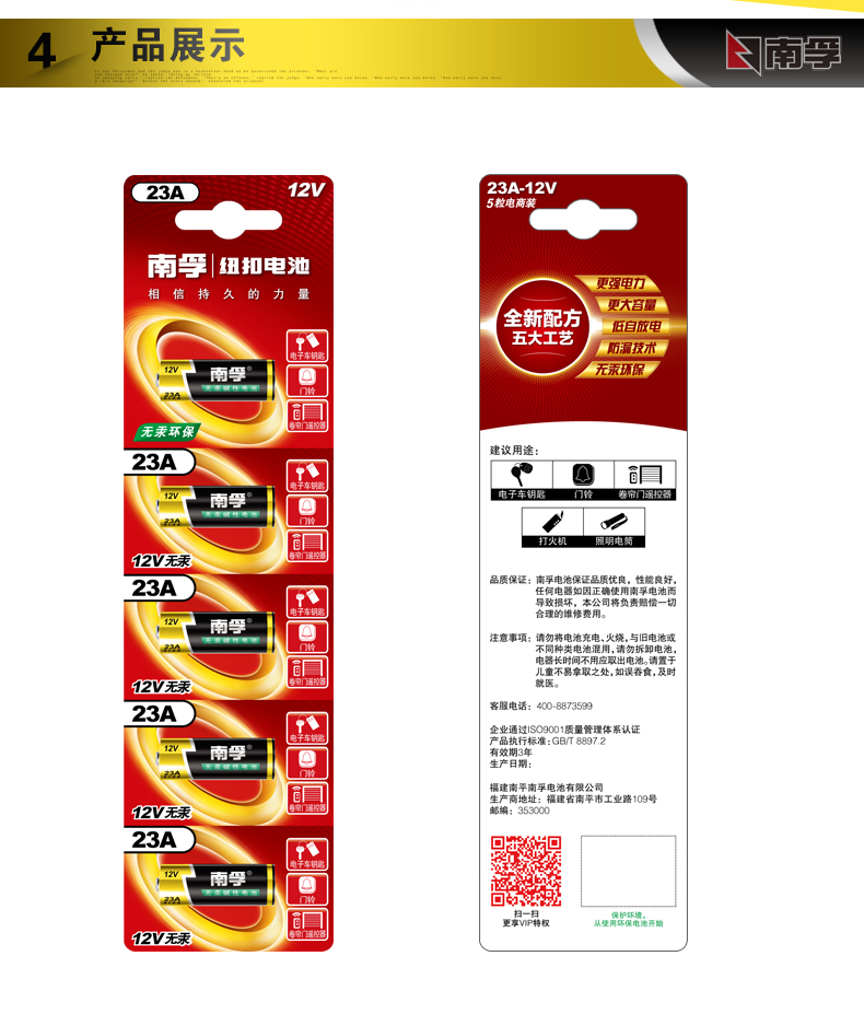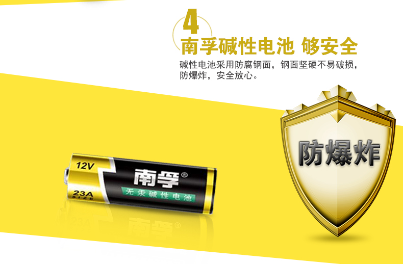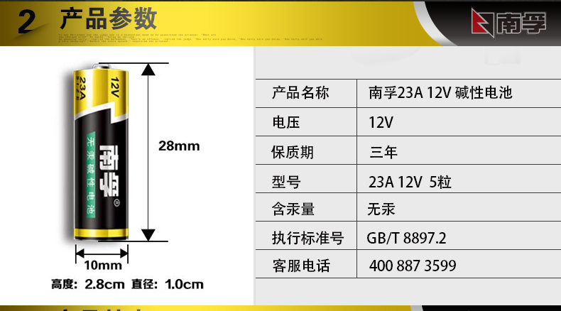 | 南孚电池23A 12V电池卷帘门铃防盗引闪器12v23a车库遥控器电池5粒 |
