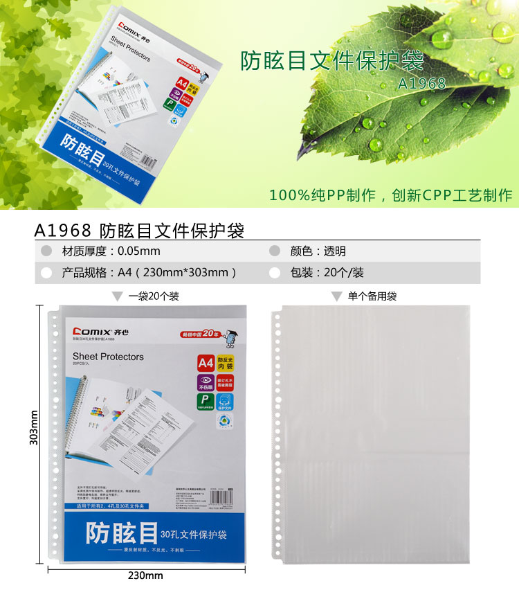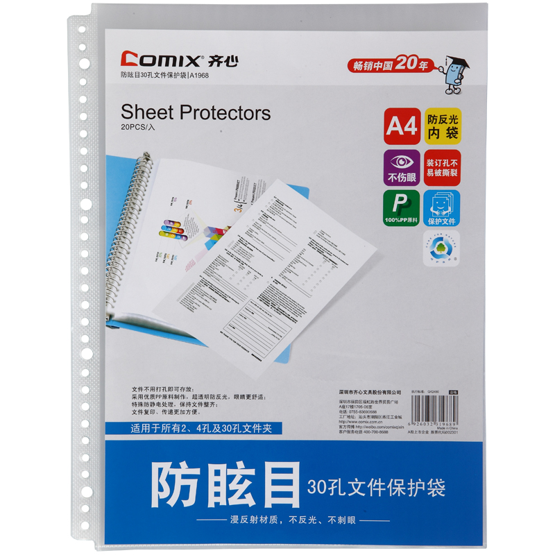 | 齐心A1968 防眩目文件保护袋 A4 30孔 20个/套 |