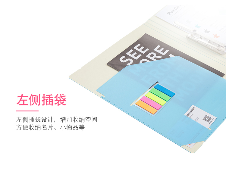 左侧插袋设计,增加收纳空间,方便收纳名片、小物品等