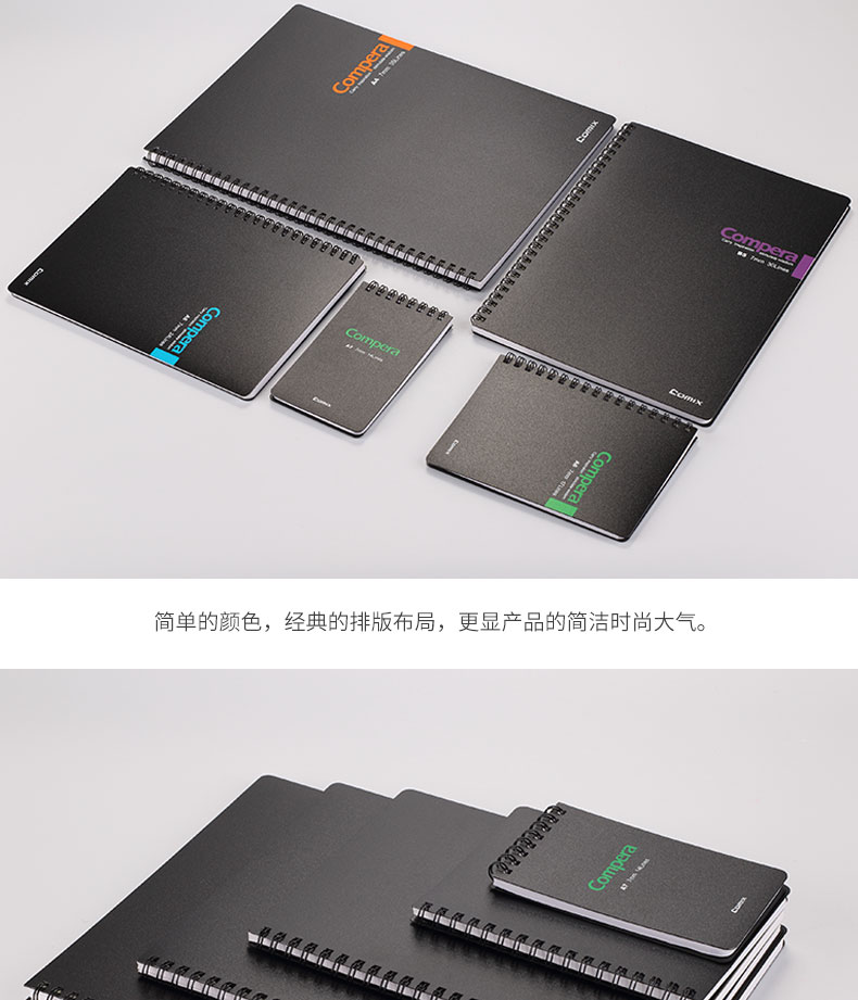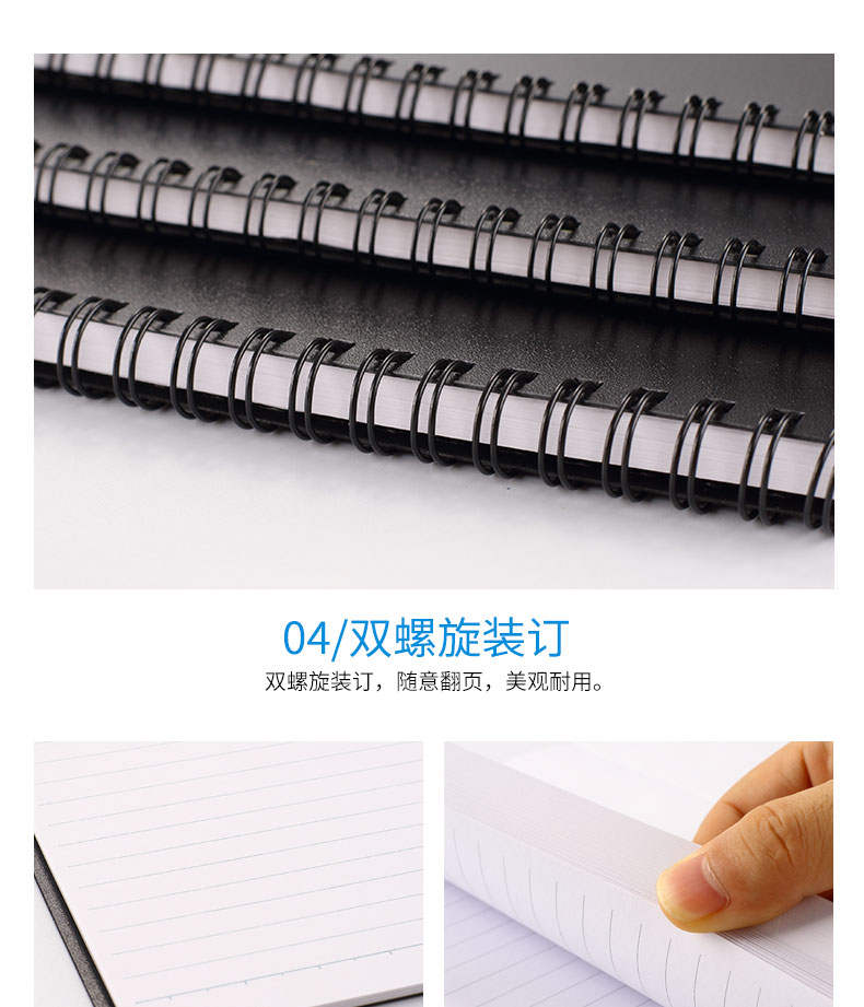 双螺旋装订,随意翻页,美观耐用,黑色PP封面,独特拉丝工艺,色彩对比鲜艳 |