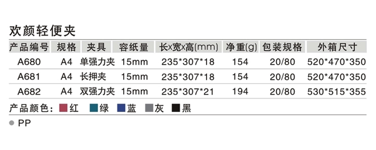 | 齐心A680,A681,A682 欢颜系列 轻便夹 A4 单强力夹/长押夹/双强力夹 |
