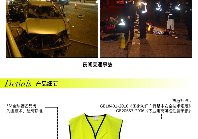 安全认证:符合中国国家强制标准GB20653-2006《职业用高可视警示服》 执行标准:GB18401-2010《国家纺织产品基本安全技术规范