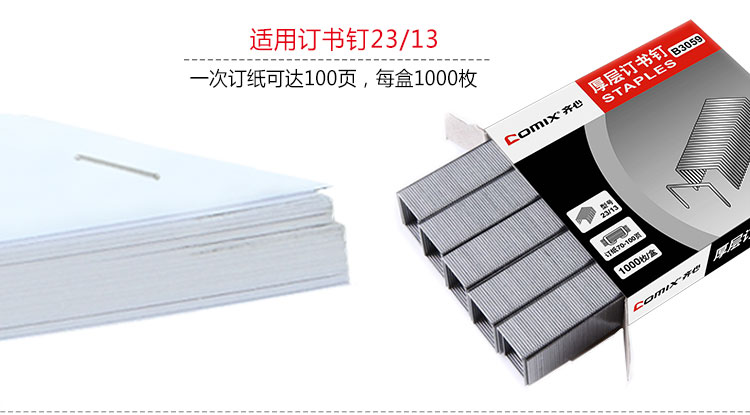 适用书钉23/13,一次钉纸可达100页,每盒1000枚