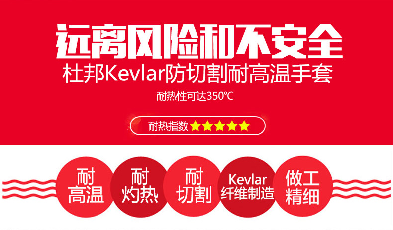 采用杜邦TM KEVLAR;外衬编织, 提供优异的耐切割和耐高温性能, 5指分,更易于操作。 |