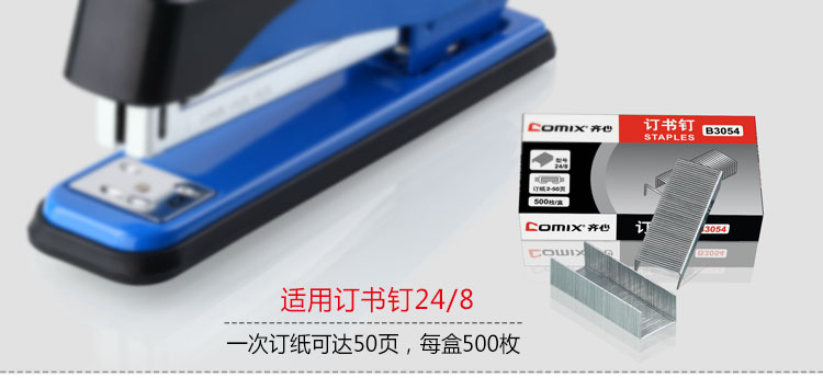 适用书钉24/8,一次钉纸可达50页,每盒500枚