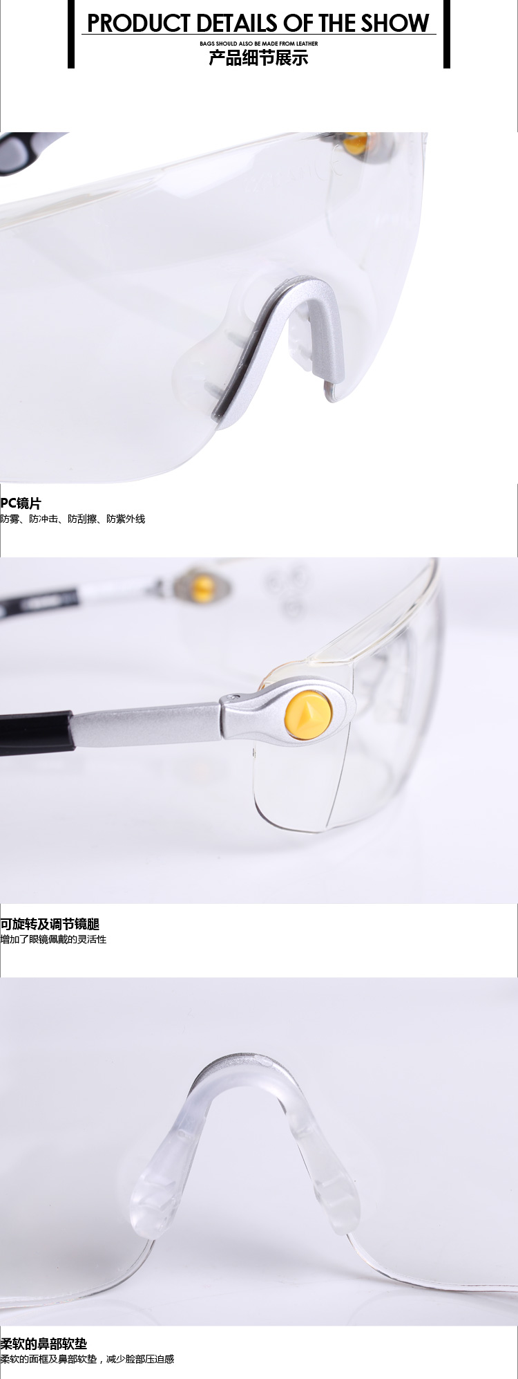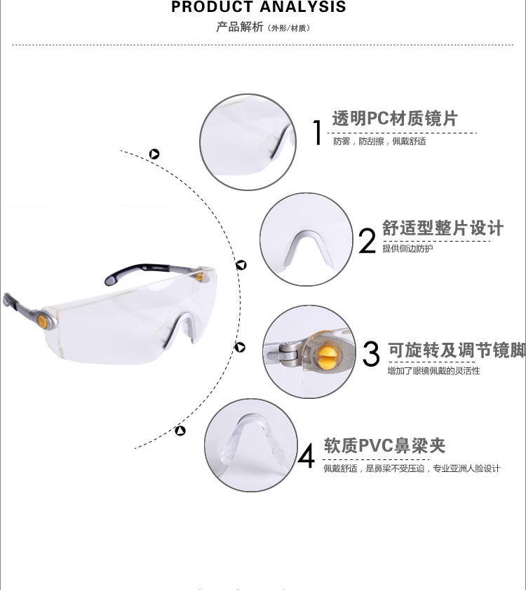 舒适型整片式侧边防护眼镜,PC镜片,可旋转及调节镜脚,软制PVC鼻梁架; 防雾、防冲击、防刮擦、防紫外线,专为亚洲人脸型设计。 |