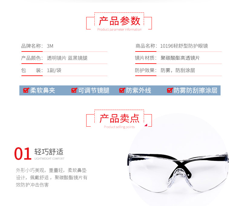 | 3M 10196轻舒型护目镜 透明无框防雾仿刮擦安全防护镜 | |||