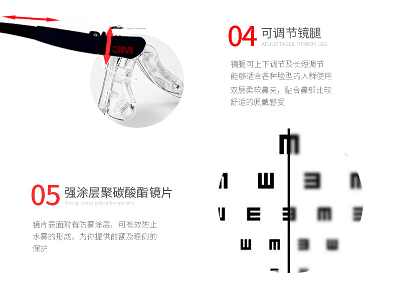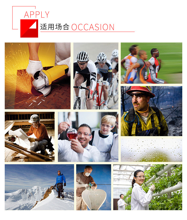 用于高速粒子冲击及液体飞溅伤害的防护和实验室、建筑工地、家务清洁、装修、日常娱乐等眼部需要防护的场所。