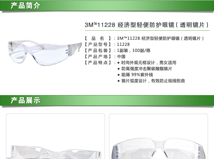 | 3M 11228经济型护目镜 透明无框防冲击防紫外线安全防护眼镜 |