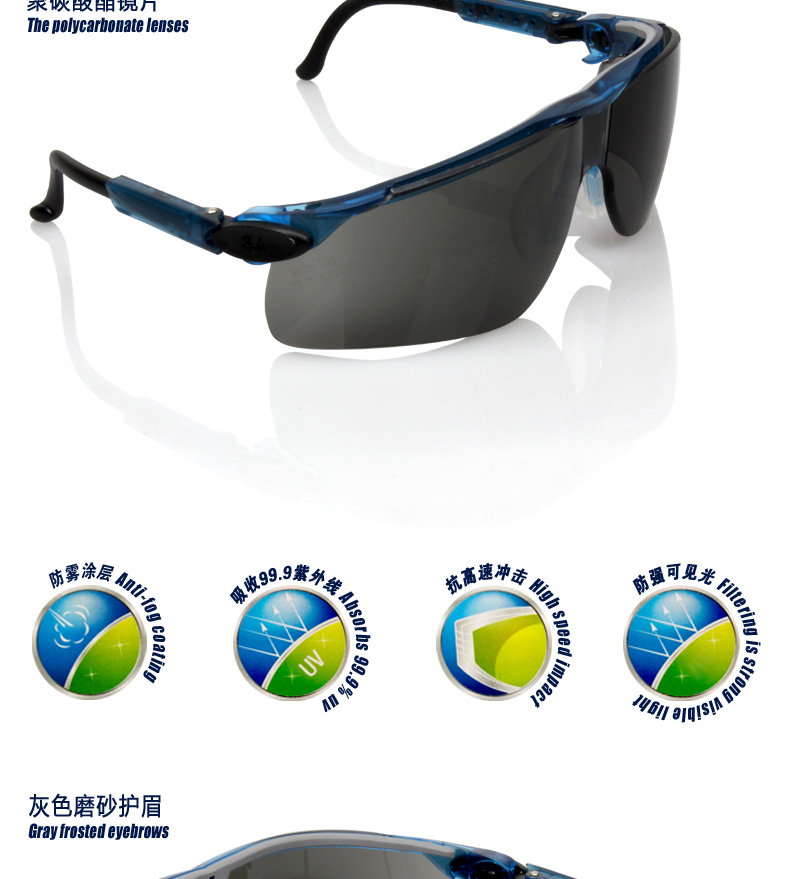 抗高冲击灰色PC镜片, 吸收99% UV,保证颜色识别